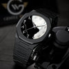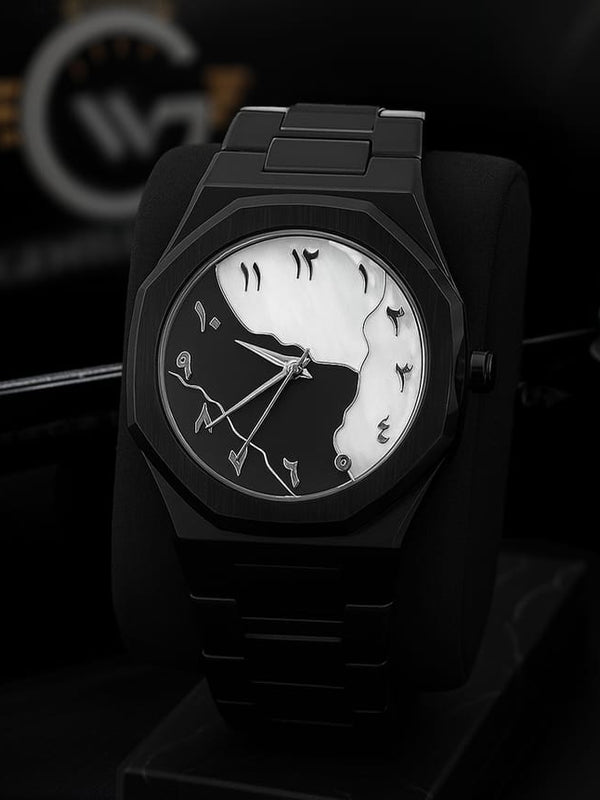 The Eclipse Noir Artisan Timepiece blends bold design with artistic flair, featuring a unique half-moon dial, abstract numeral markers, and a sleek black stainless steel body.